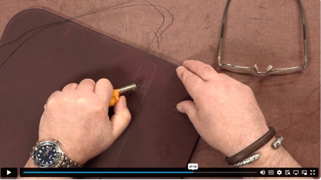 This is how to approach the working seam, or traditional saddle stitch when stitching leather.